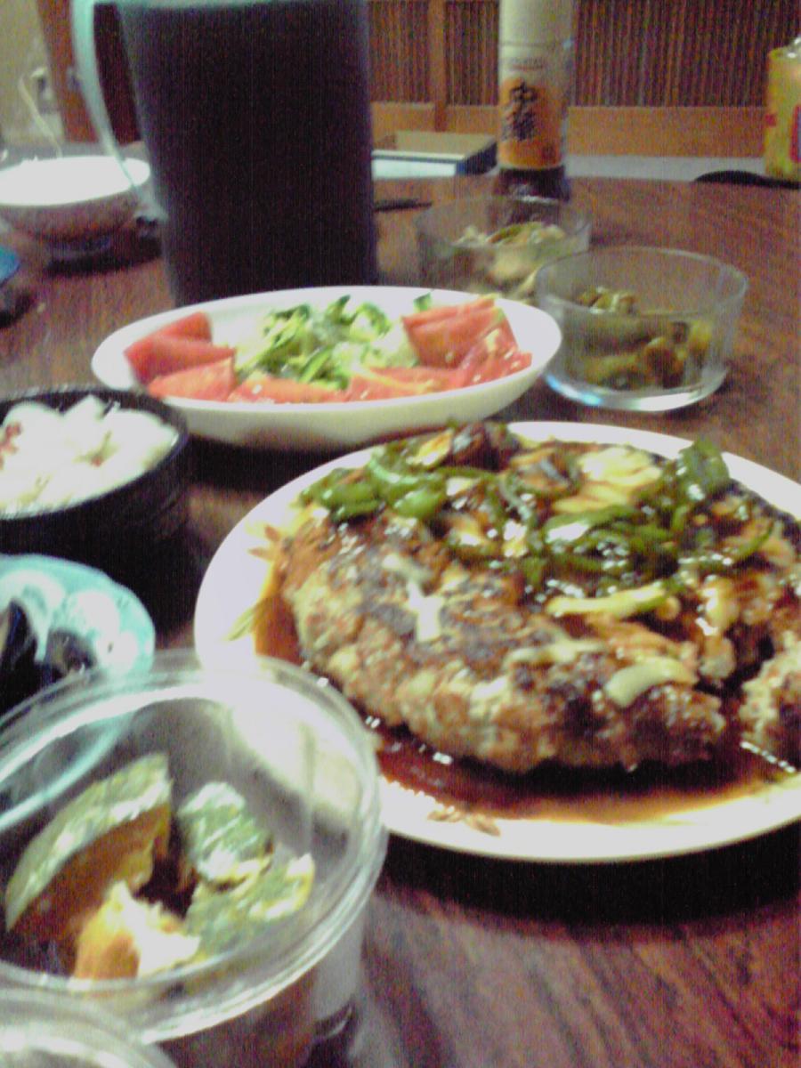 手前のお好み焼きみたいなのがハンバーグ。